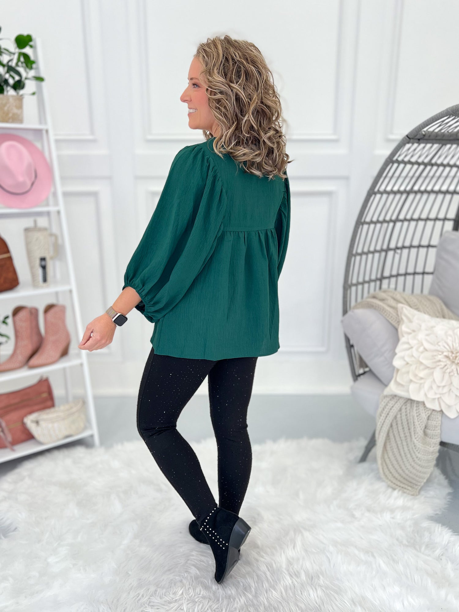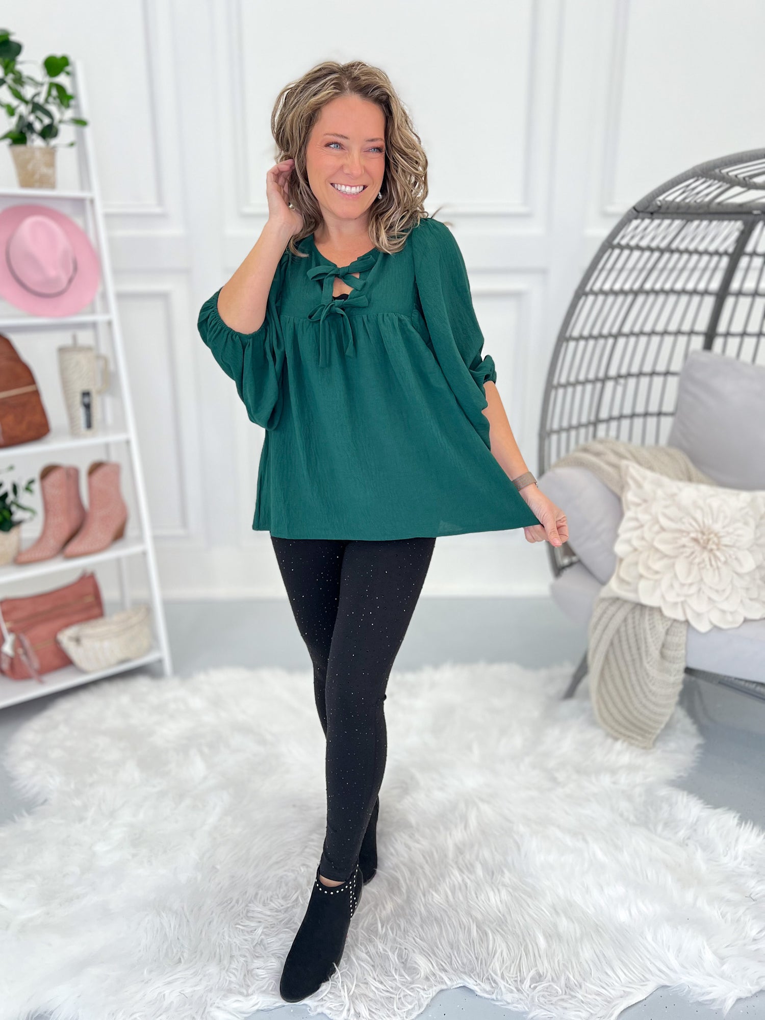Effortlessly chic and flattering, this deep green blouse is your go-to for dressy or casual days. The tie neckline and gathered bust create a feminine silhouette, while the flowy fit and elastic cuffs keep it comfy and cute. Perfect for pairing with denim or sleek leggings.