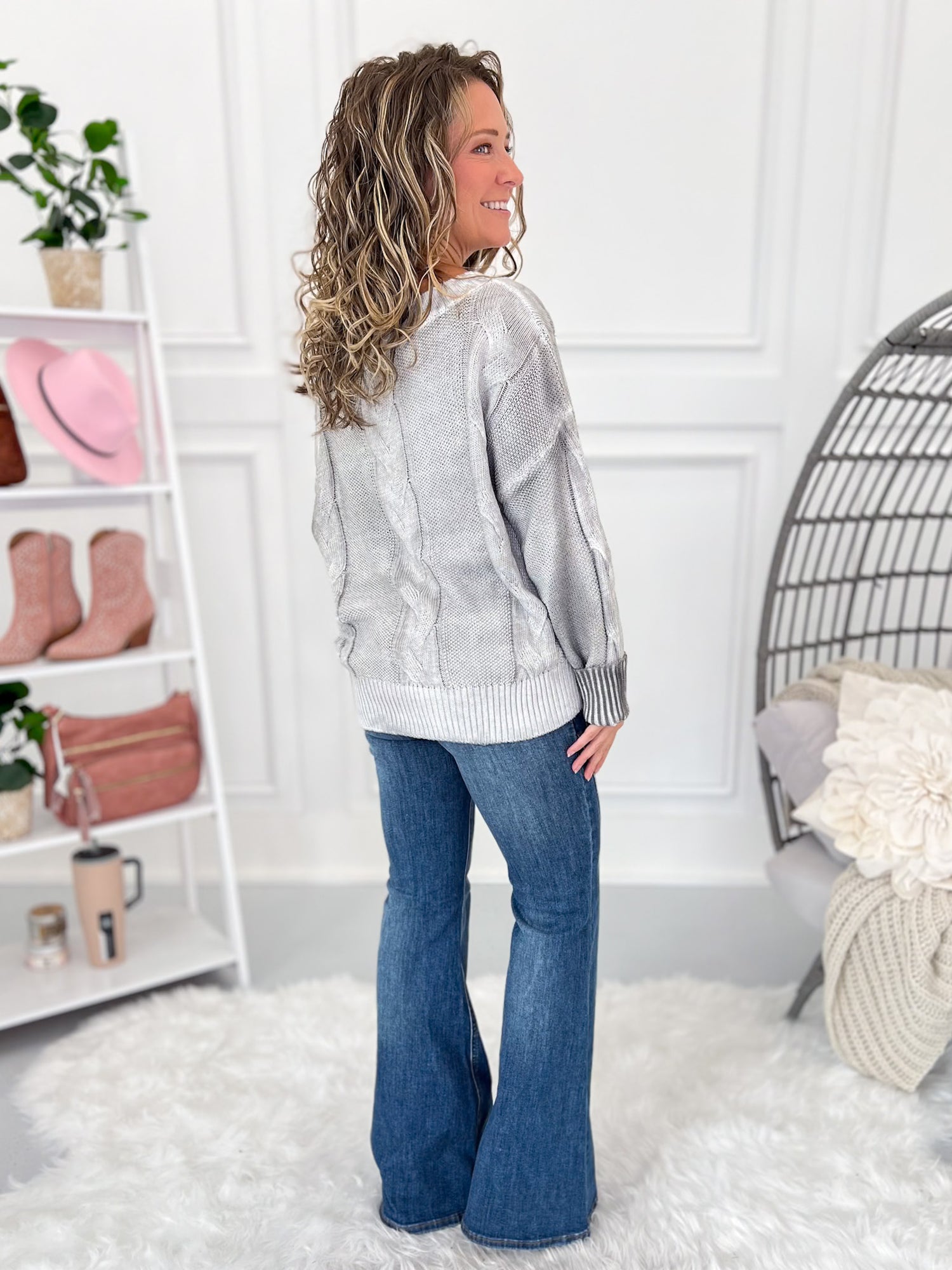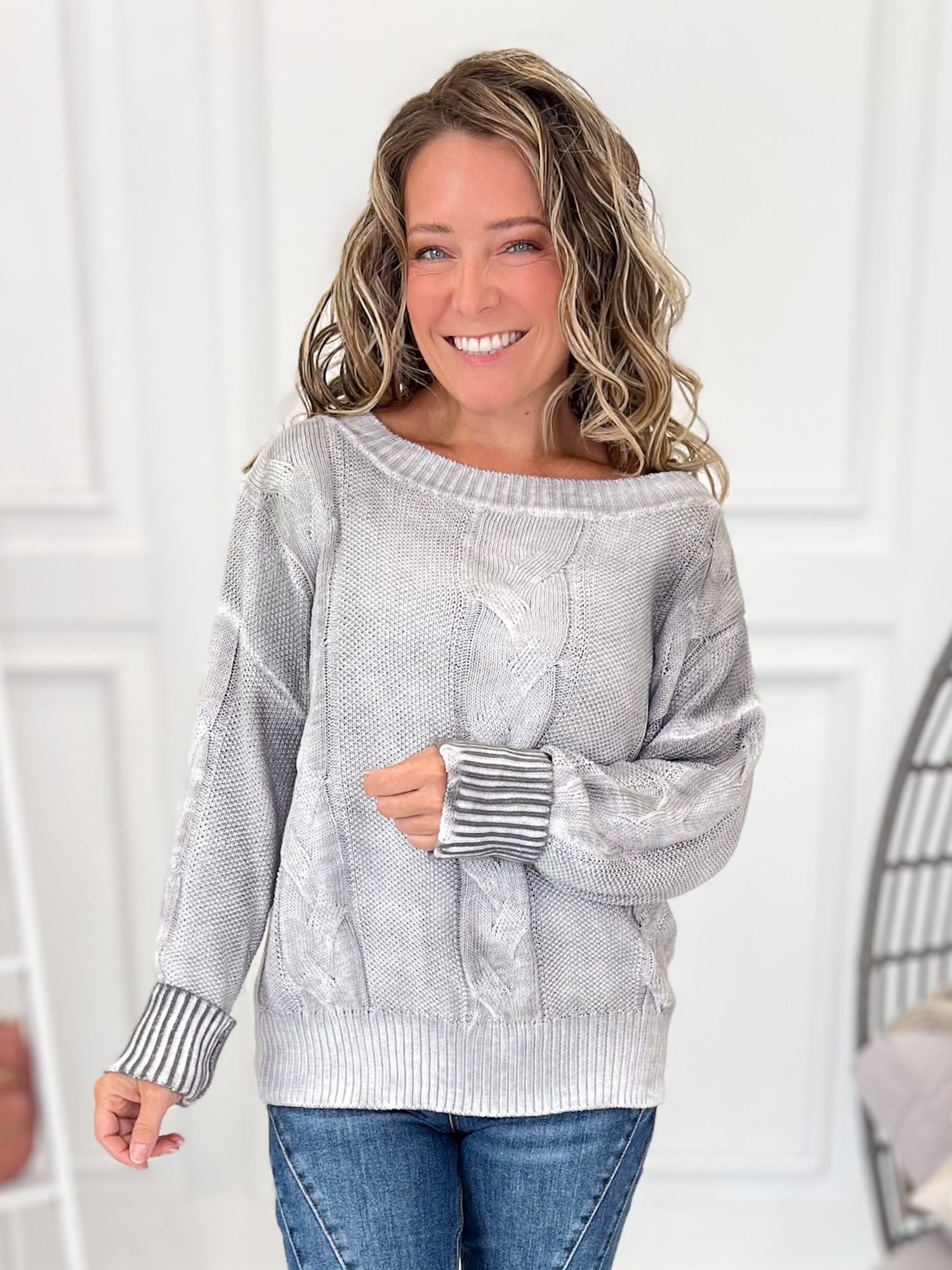 Edgy meets cozy with this smokey washed cable knit sweater. The boat neckline gives you the option to wear it on or off the shoulder, while the lightweight knit keeps it breathable and comfy. With its loose, easy drape, this one’s perfect for pairing with your favorite jeans or layering up for an effortlessly chic vibe.