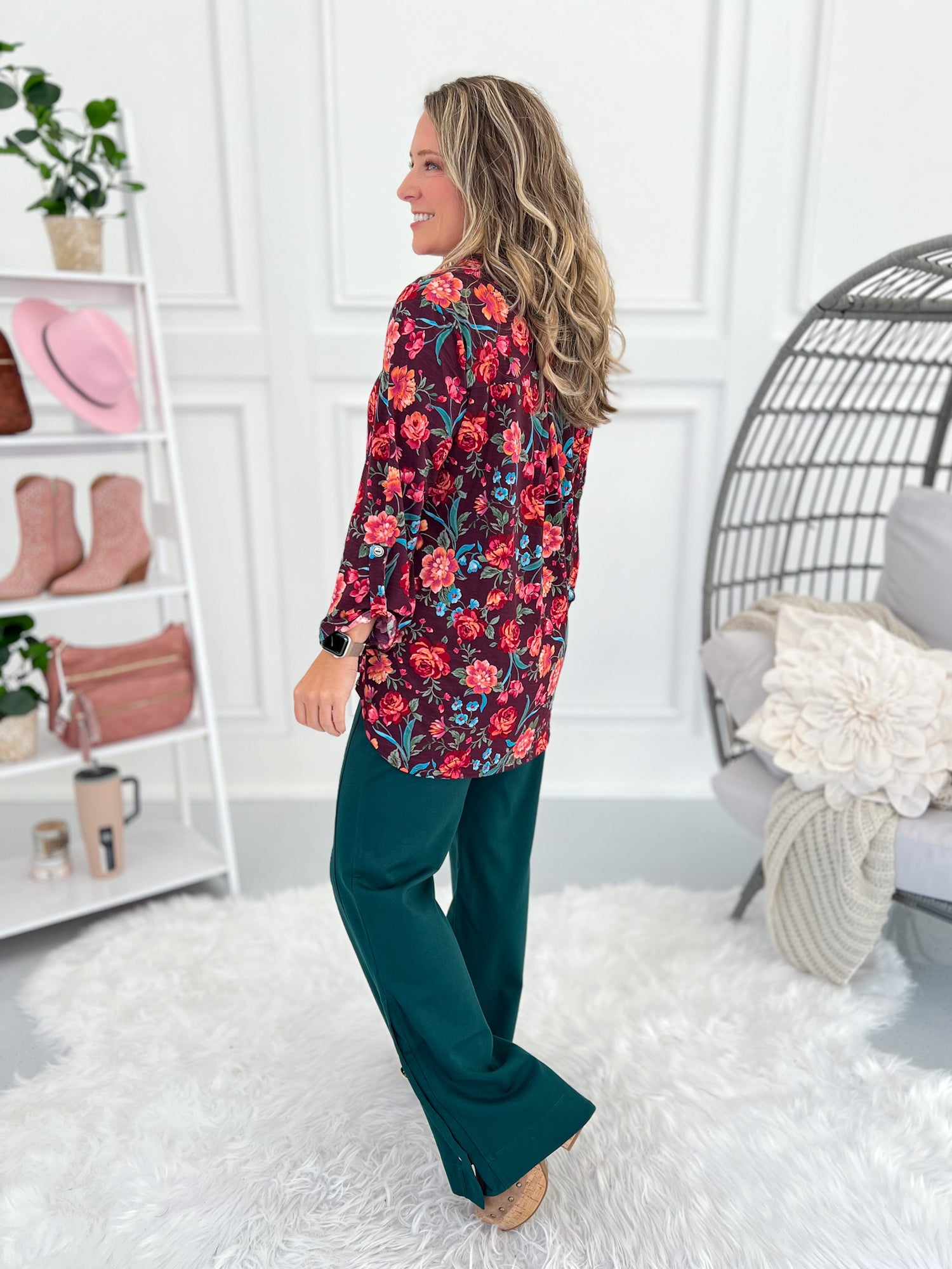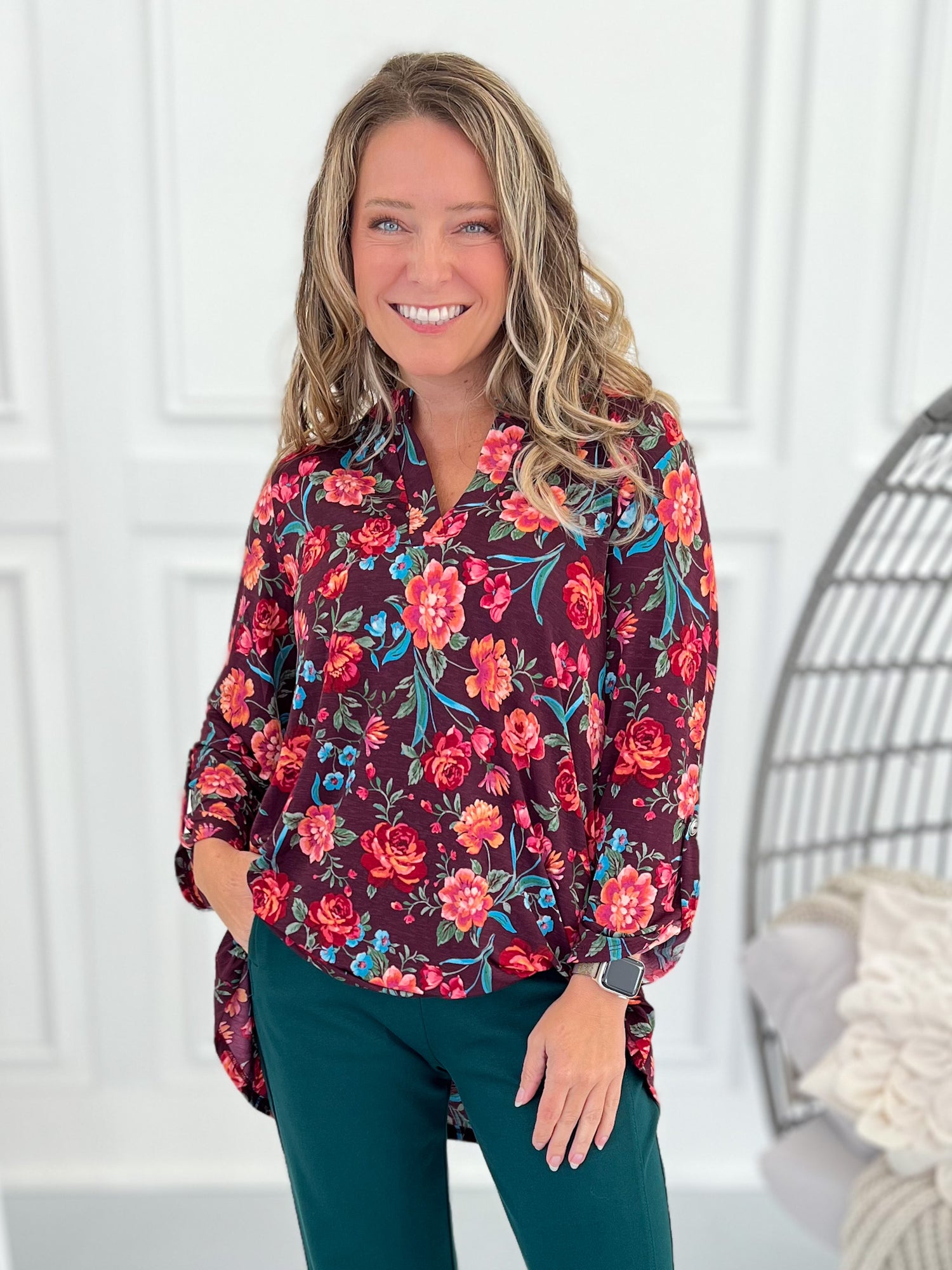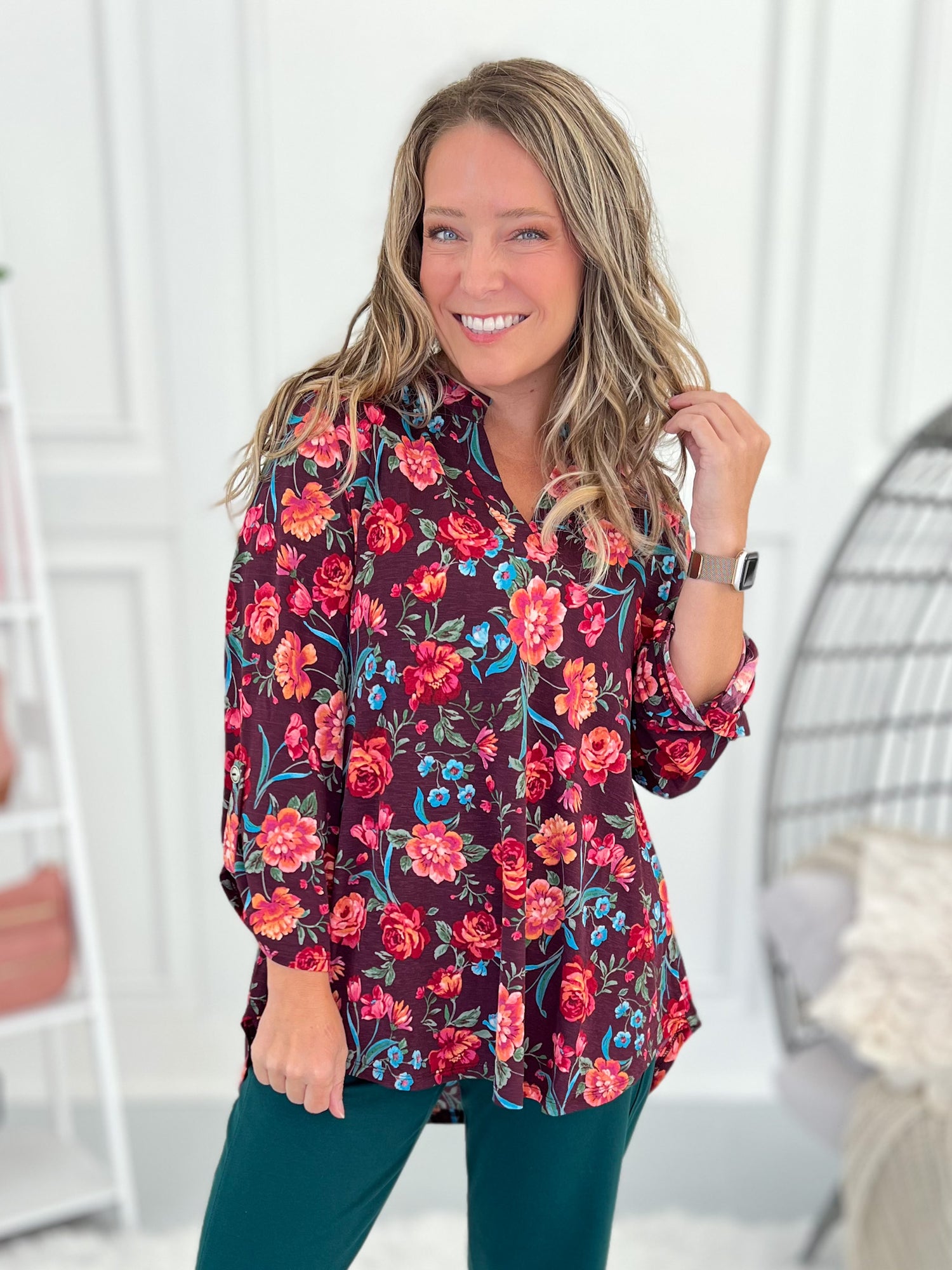Rich burgundy with painterly florals brings a pop of color to your fall lineup. Tuck the front into trousers, or leave it loose with jeans for an easy, flowy finish. Don't forget to check out the Magic Pants and Blazers that match perfectly too!