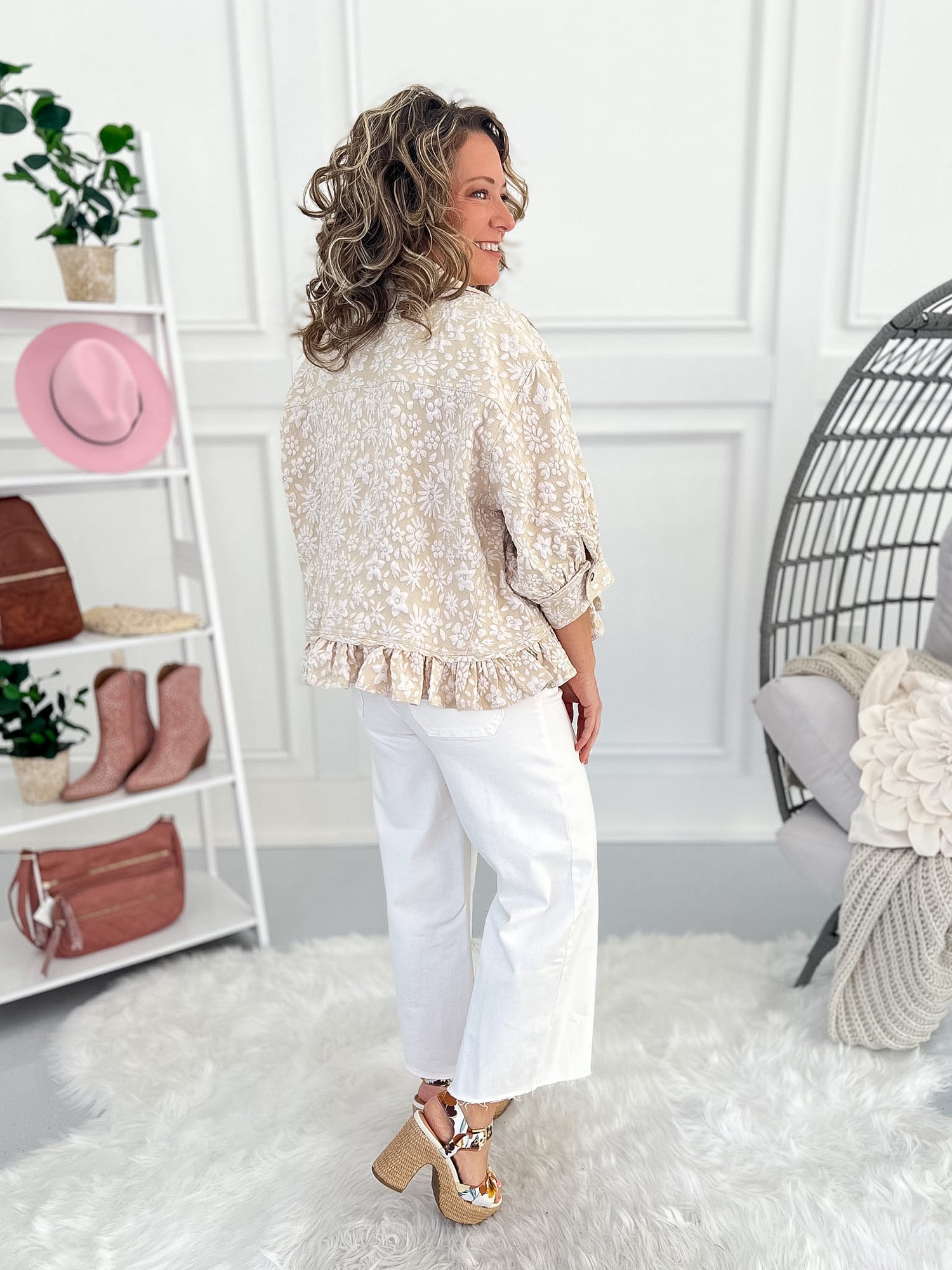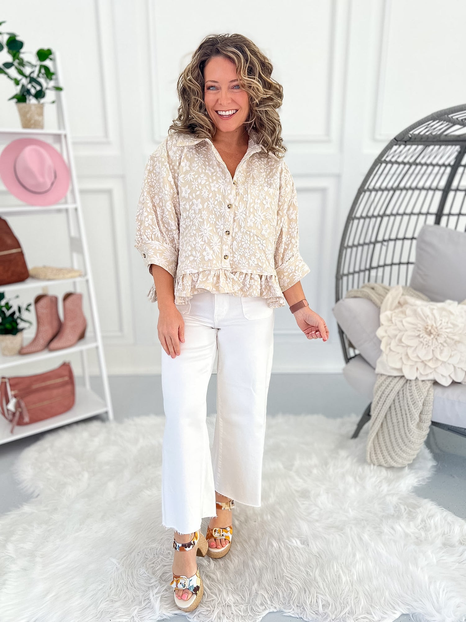 This neutral jacquard button-up blouse features beautiful embossed floral texture with the perfect balance of structure and softness. Designed to be worn as a top or a lightweight jacket, it’s an easy elevated layer for everyday outfits.