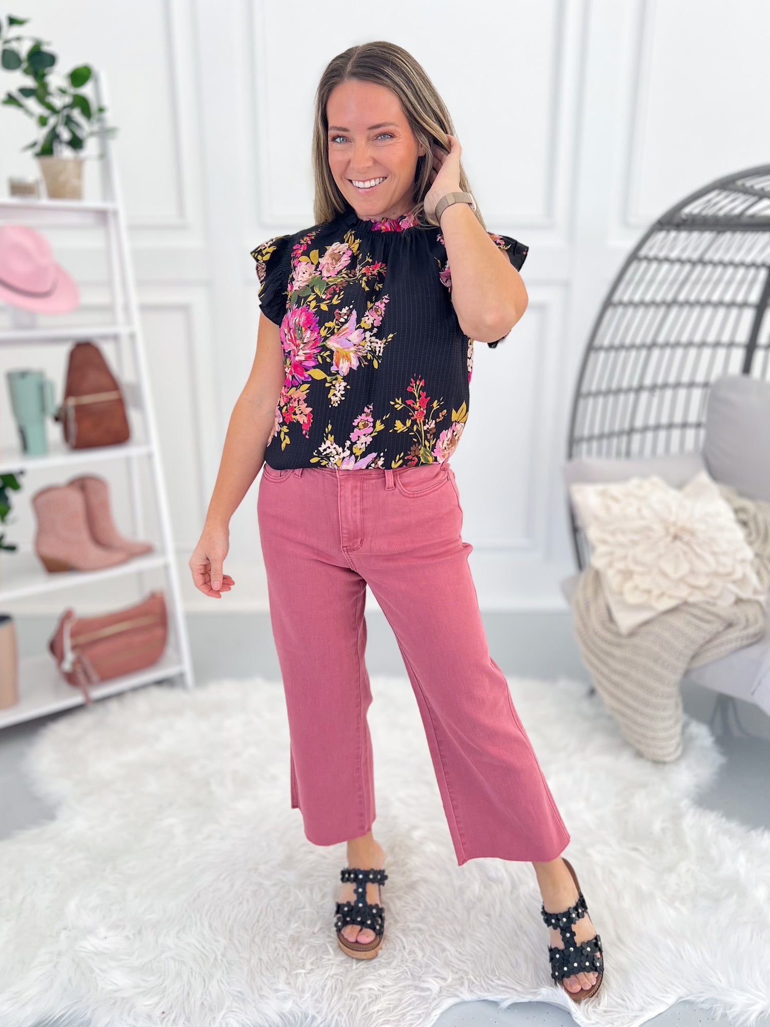 This stunning floral instantly elevates any look with ease! The bold colors pop against the black background, making it a fun option for spring and summer, without being sheer. Pair with dress slacks, denim or our Blushing Blues Judy Blue wide legs!