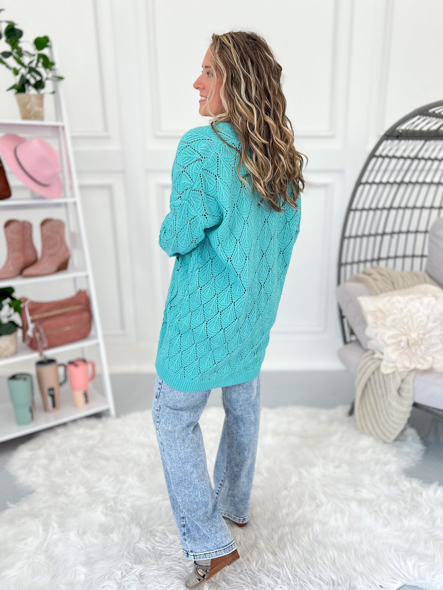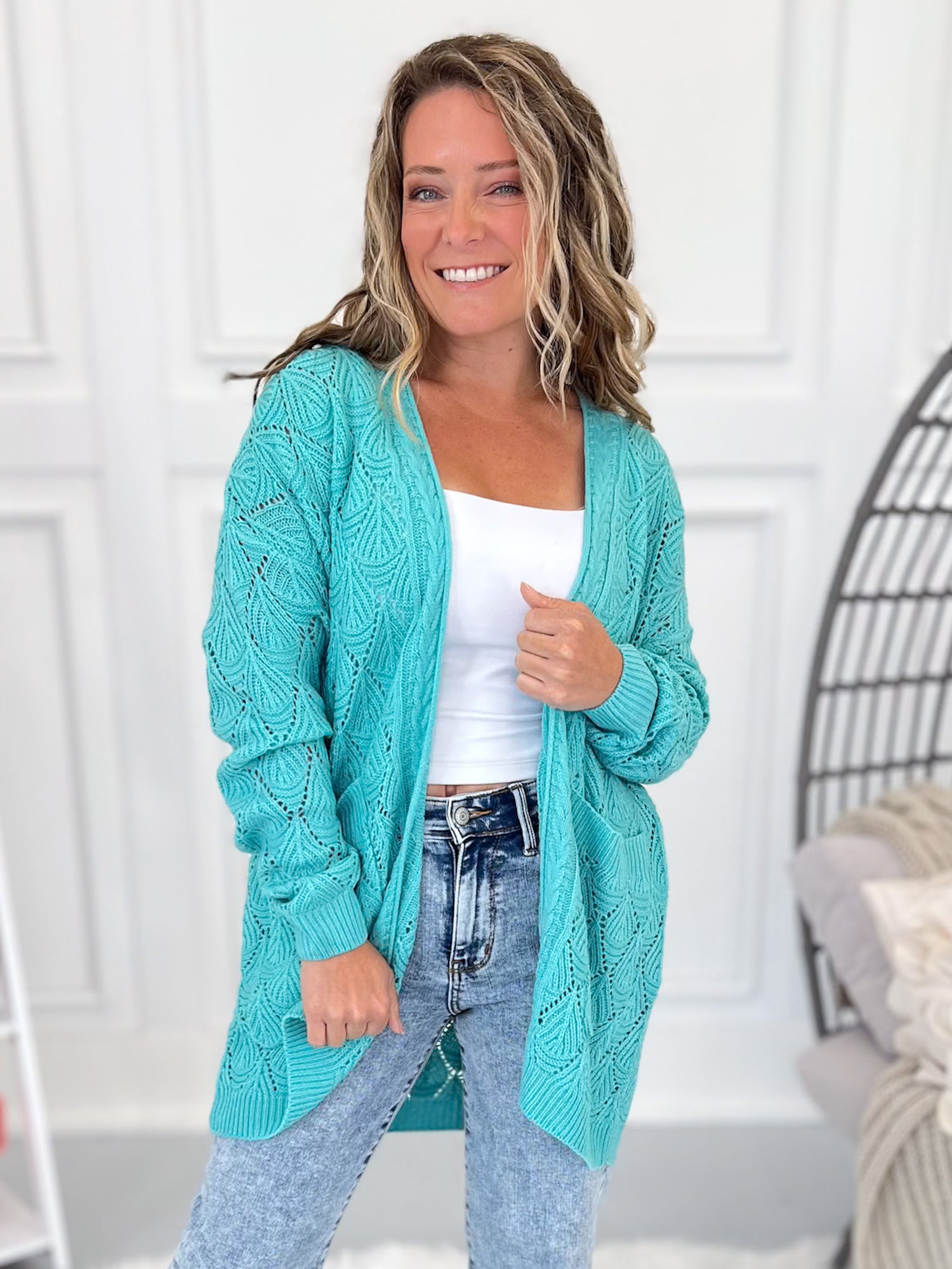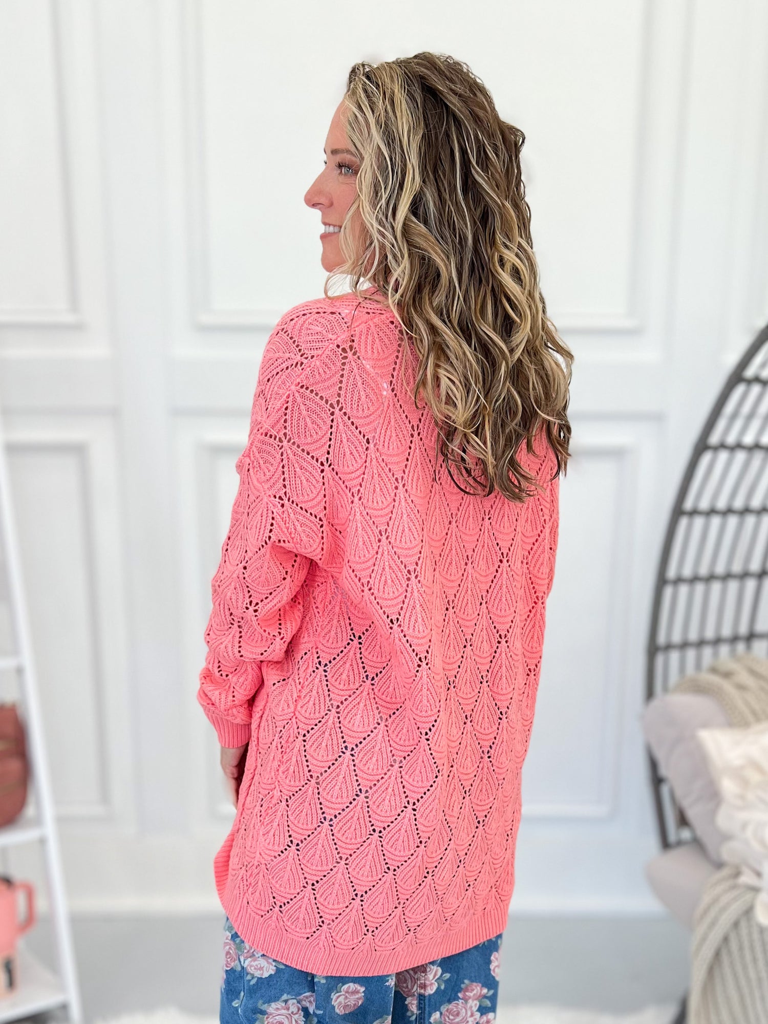 This dreamy knit cardigan is one you’ll want to wrap yourself in again and again. With its gorgeous open knit texture, cocoon-style hem, and cozy feel, it’s perfect for tossing on over basics or adding a soft pop of color to your outfit. From chilly mornings to breezy evenings, it’s a layering go-to all year long.