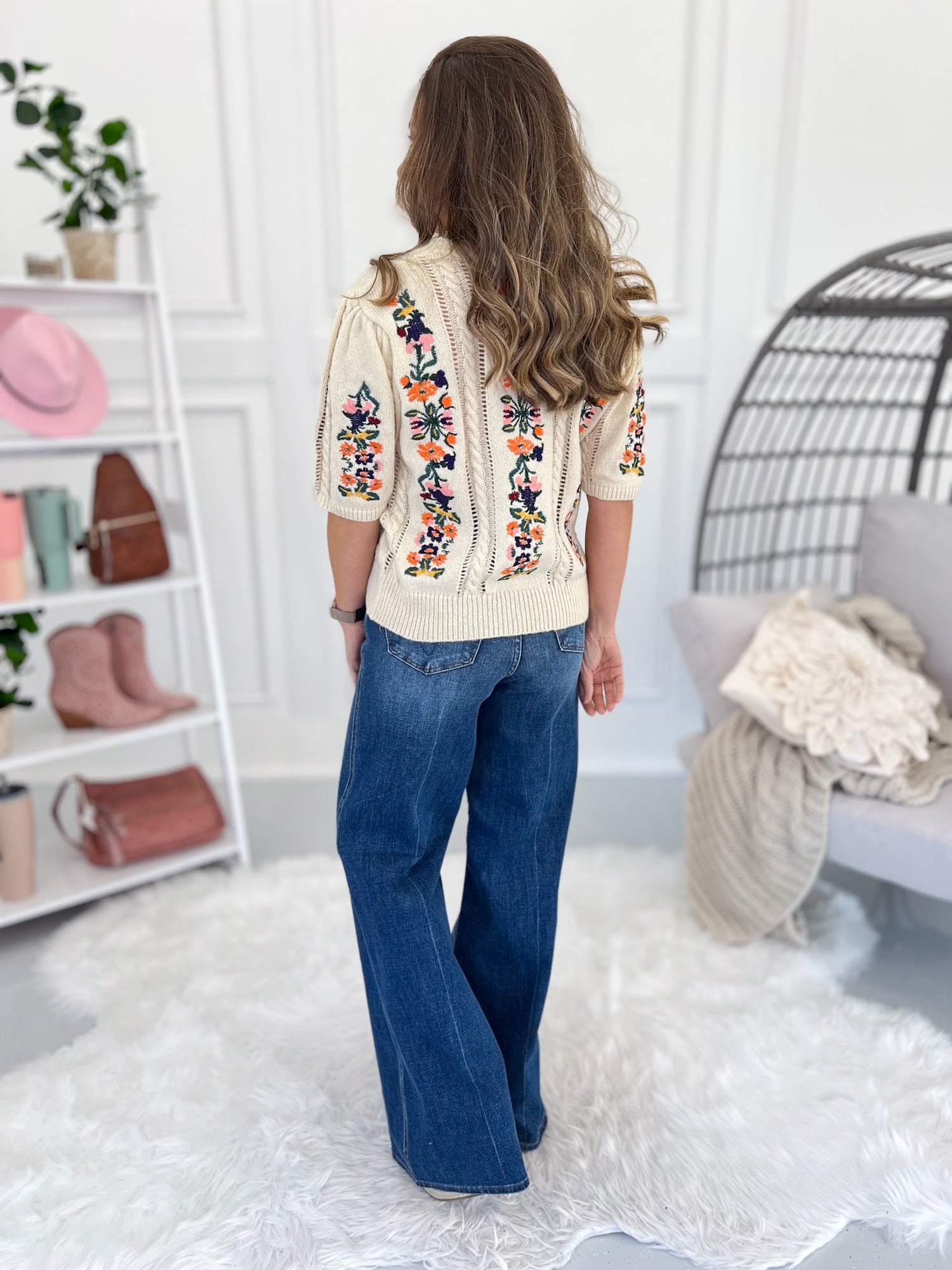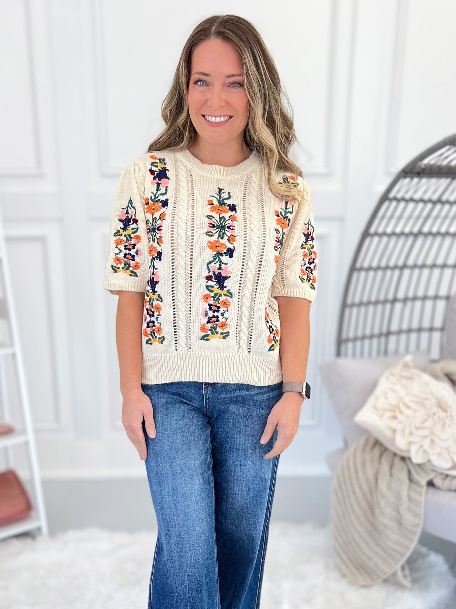 - Floral Embroidery: Colorful stitched florals that pop against the knit