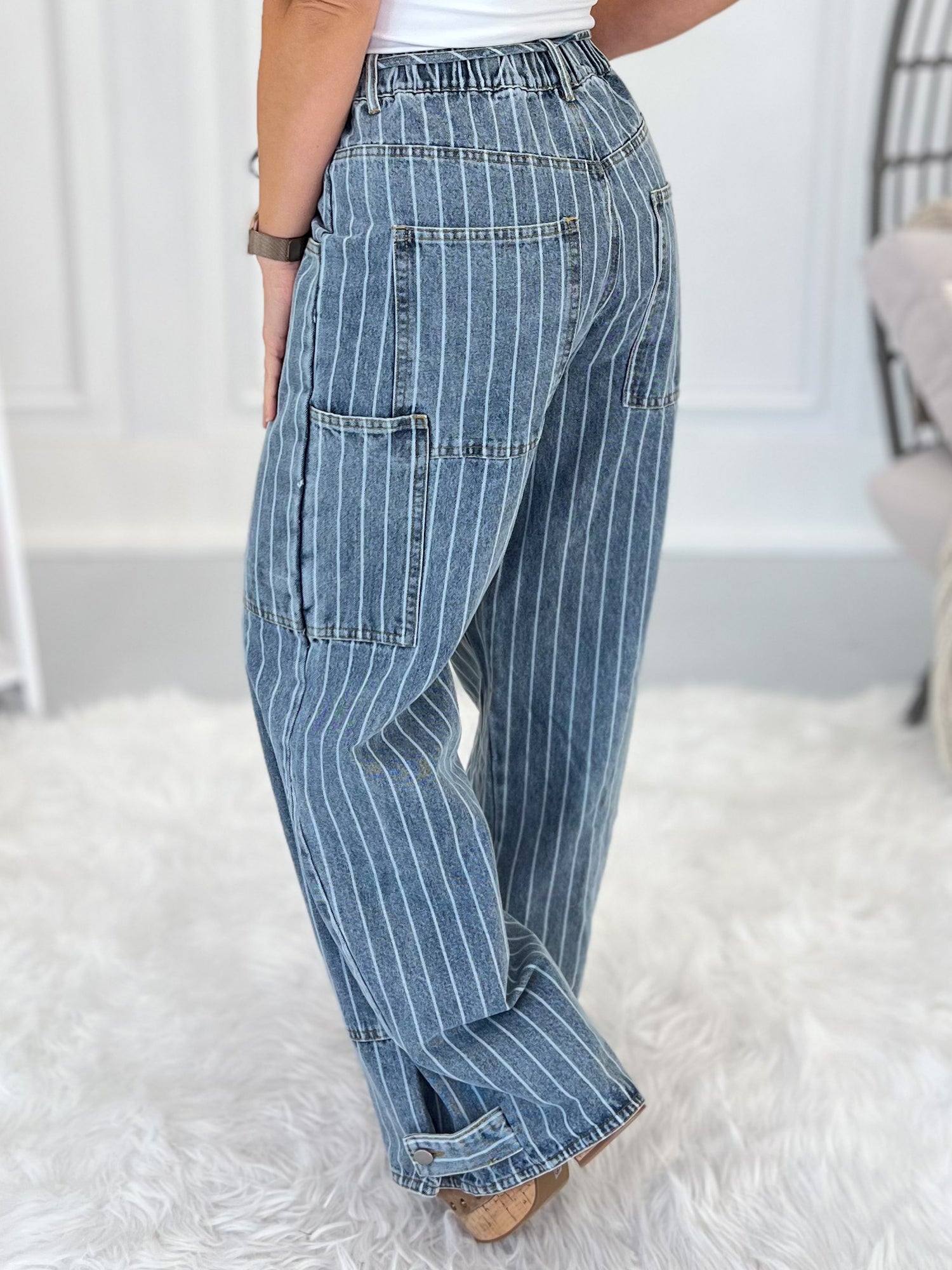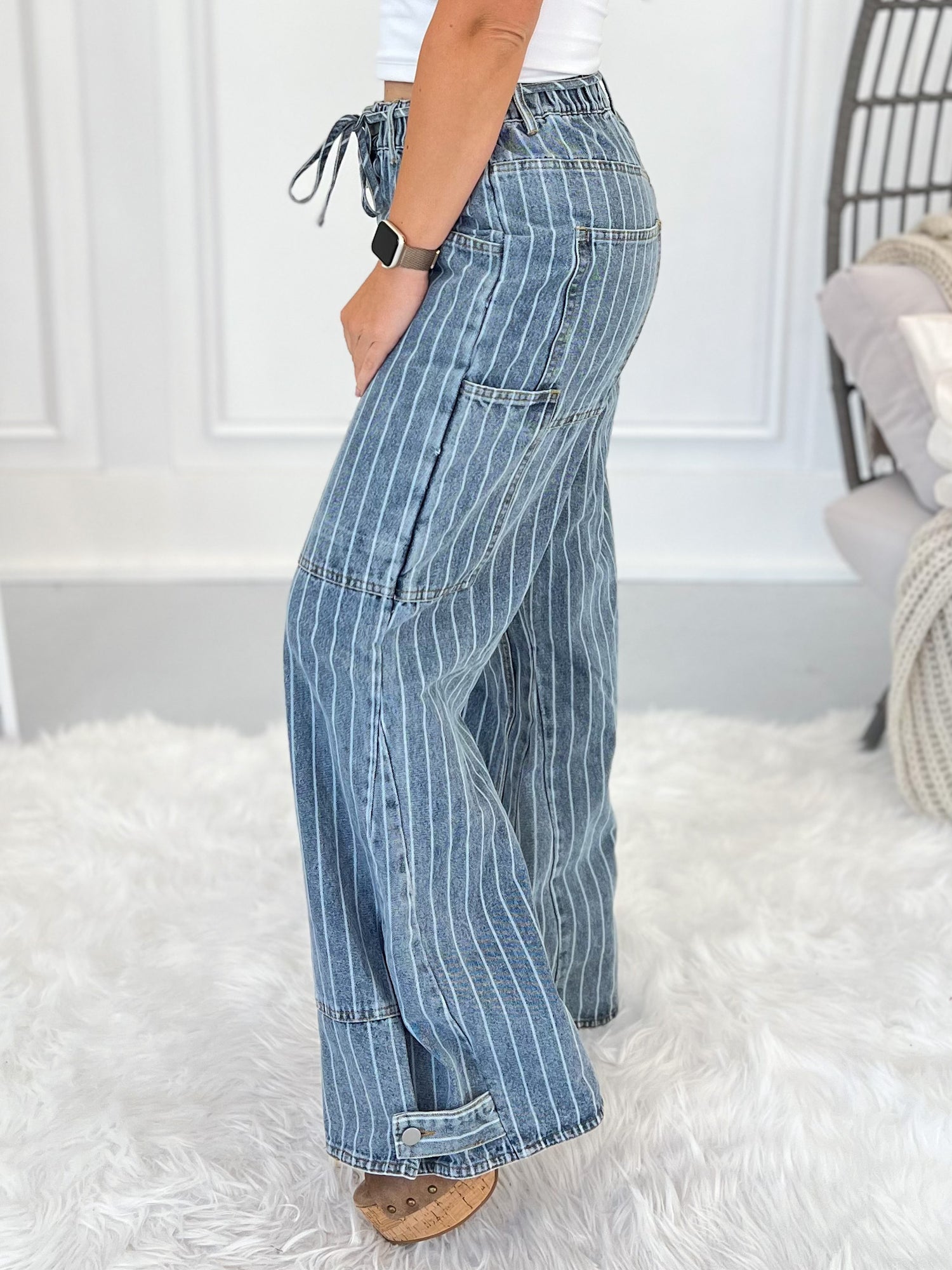 Say hello to the denim that works as hard as you do. These pinstripe jeans mix sporty and chic with their jogger-style waist and roomy straight leg fit. Pair them with a basic tank and wedges for an easy weekend look, or throw on sneakers and a hoodie for laid-back street style.