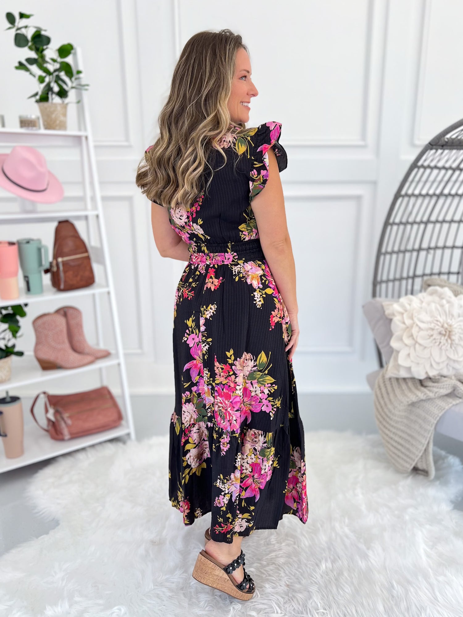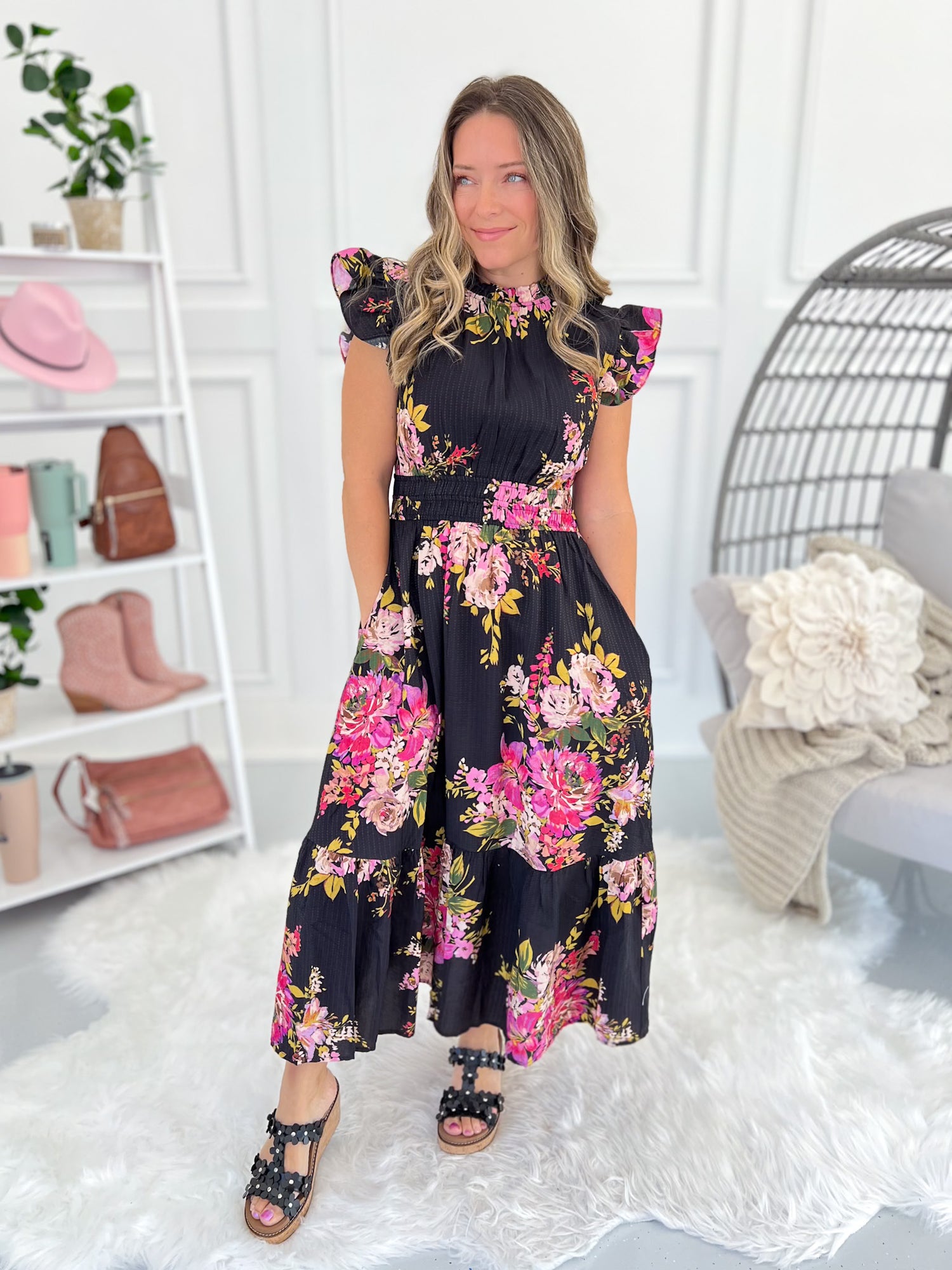 The most stunning spring and summer dress we've ever seen! The colors just pop and the silhouette is so elegant and classy. Pair with a black heel or wedge and that's all you need to style this dress for any event!