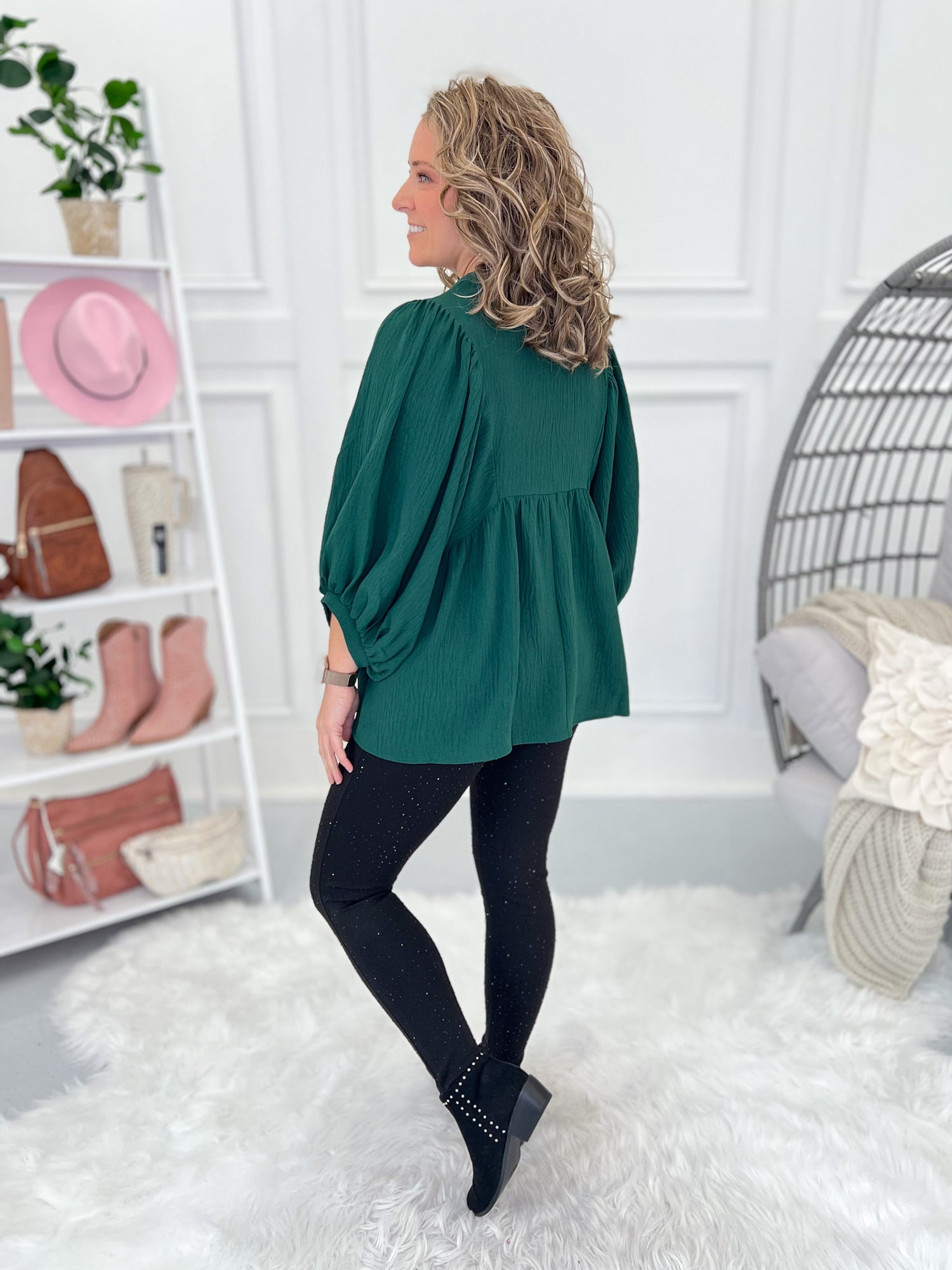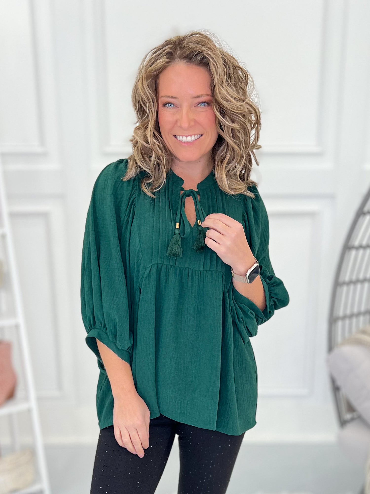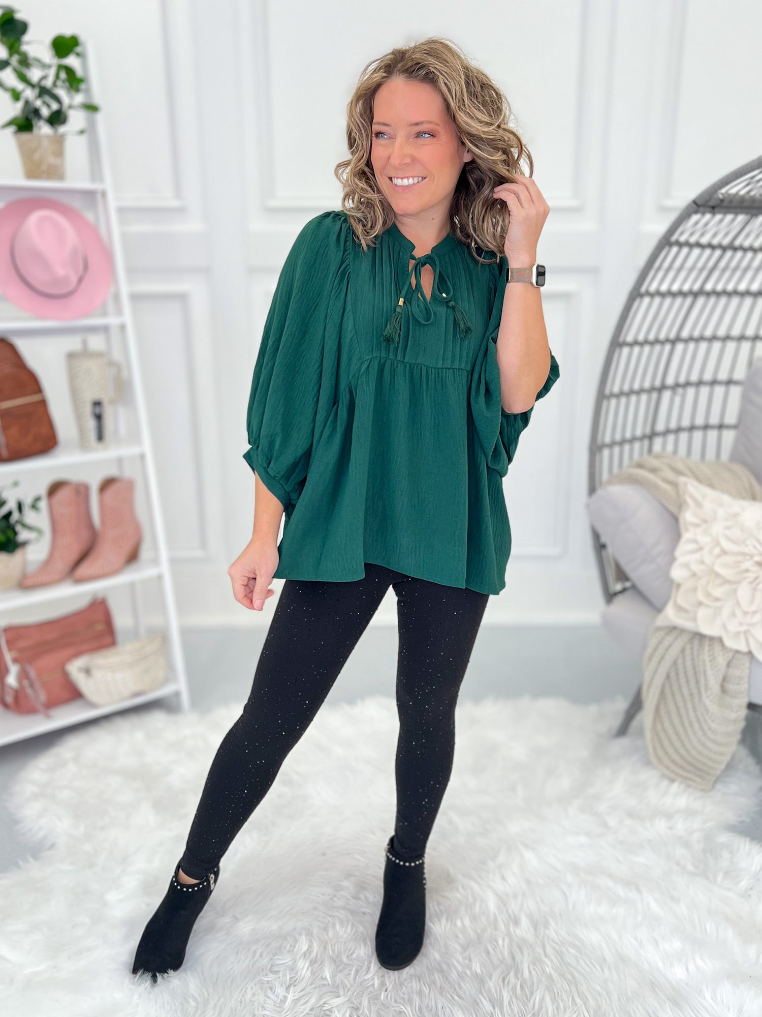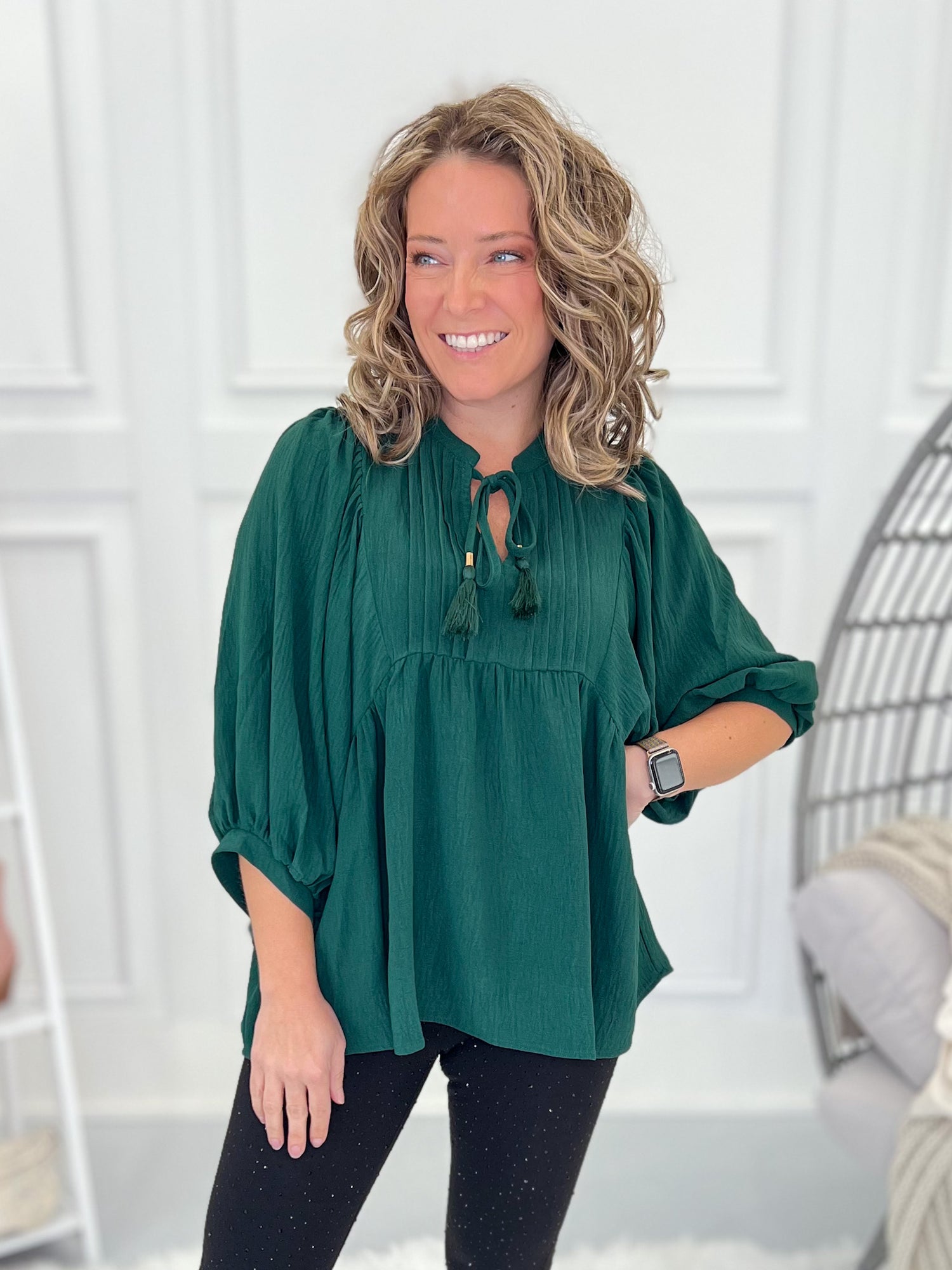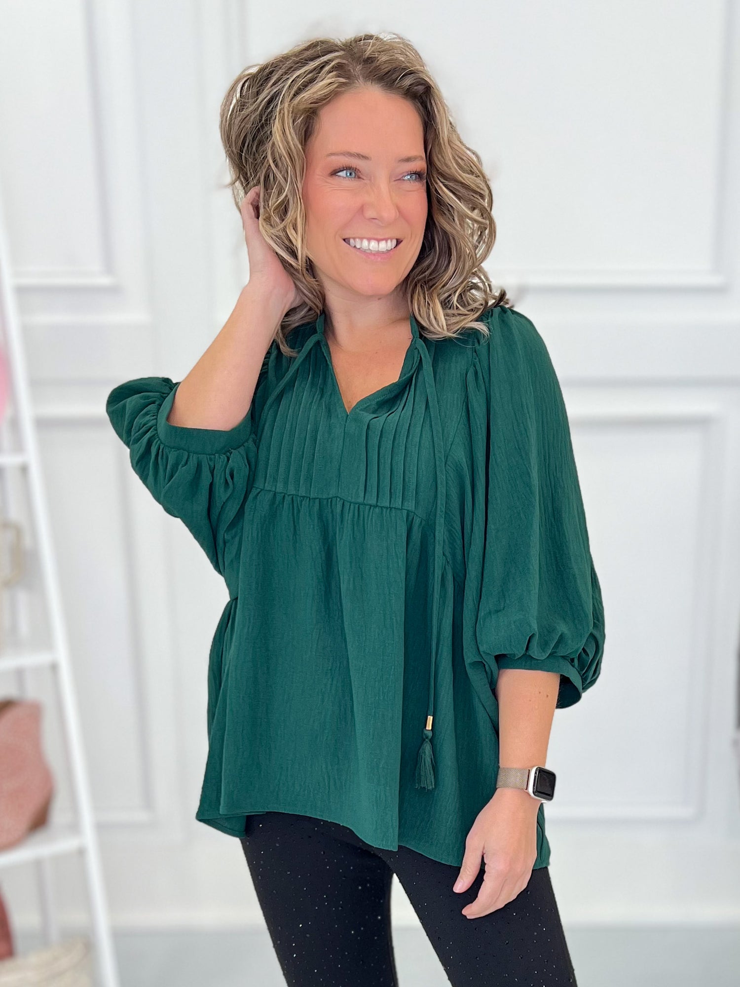 Write your own style story in this flowy babydoll top with the prettiest details. Made from airy woven fabric with a flattering drape, it features pintuck pleats, a self-tie neckline, and balloon sleeves for an effortless, feminine look. Style it with skinny jeans or leggings for an easy chic vibe!